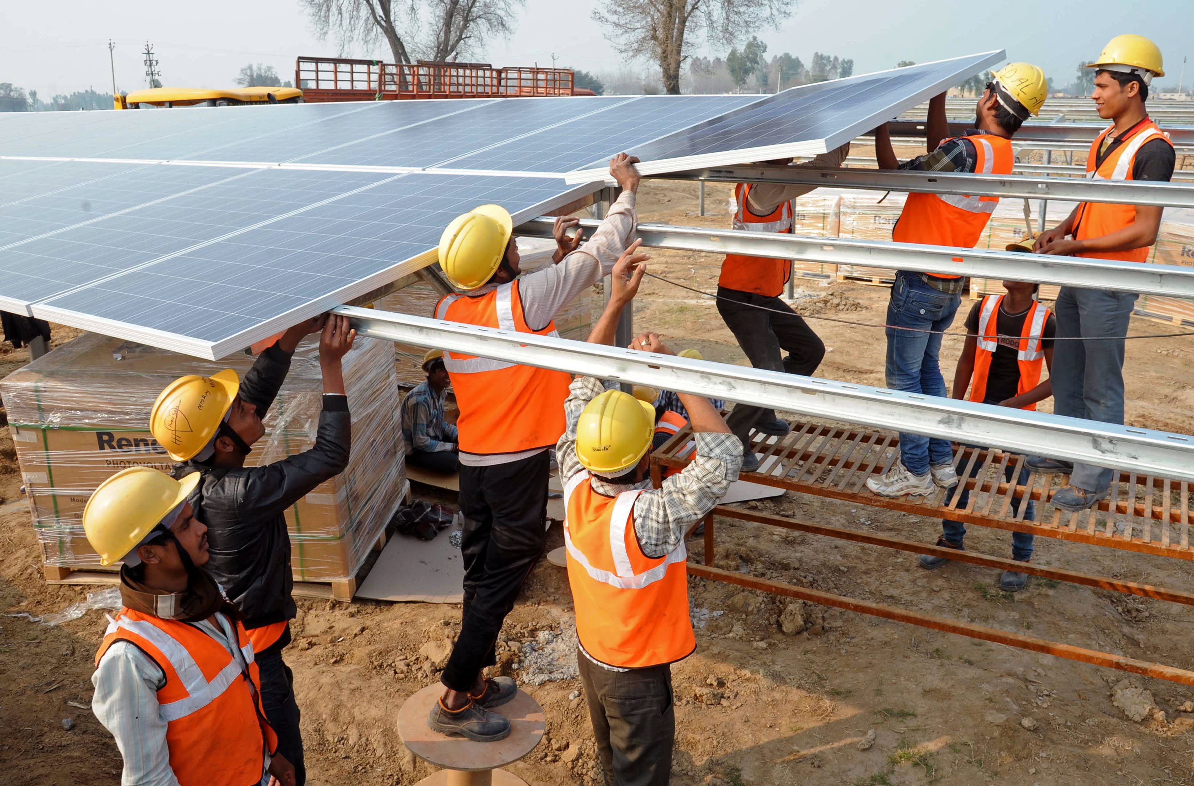 Solar panels are usually made from silicon, or another semiconductor material installed in a metal panel frame with a glass casing. When this material is exposed to photons of sunlight (very small packets of energy) it releases electrons and produces an electric charge.